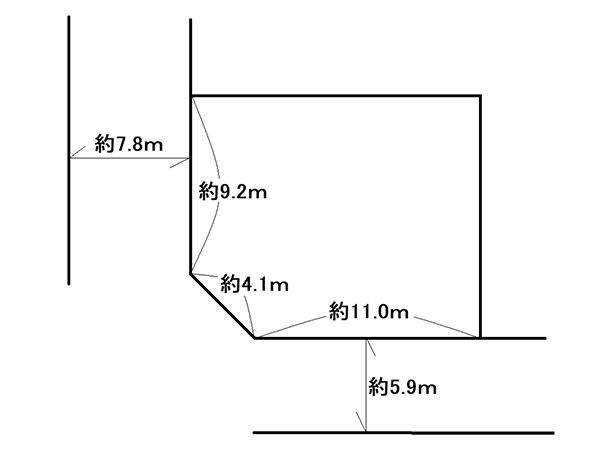 | 備考 | ※公簿面積:165.33㎡、実測面積:165.18㎡ ※境界確定済み ※現況:上物有 ※引渡日:相談 ※間口:[西側]約9.2m[南側]約11m[角切]約4.1m ※幅員:[西側]約7.8m[南側]約5.9m ※用途地域:工業地域、建ぺい率:60%、容積率:300% ※建物解体後、更地渡し |